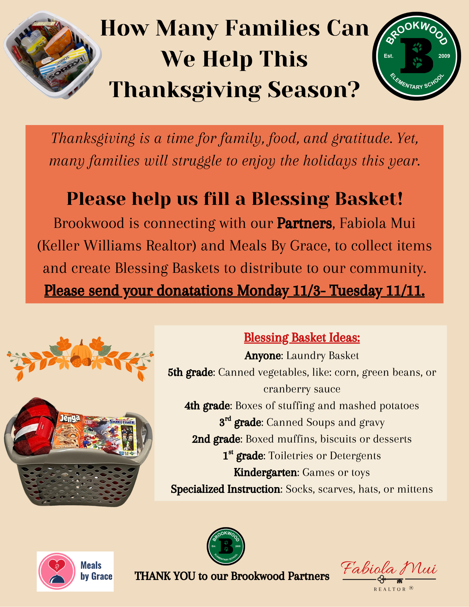 Brookwood is connecting with our Partners, Fabiola Mui (Keller Williams Realtor) and Meals By Grace, to collect items and create Blessing Baskets to distribute to our community.